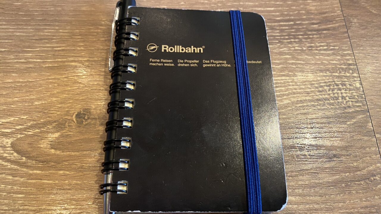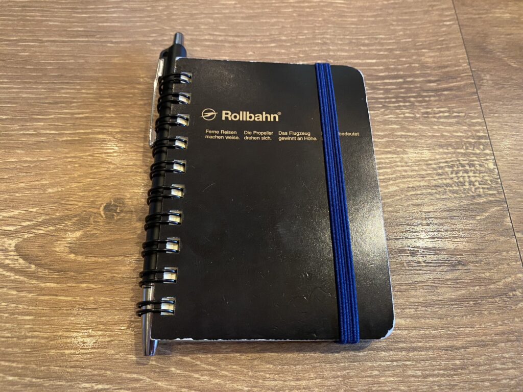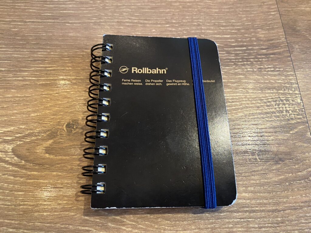 - ポケットサイズのスパイラルノートにペンを差し込んで持ち運ぶ