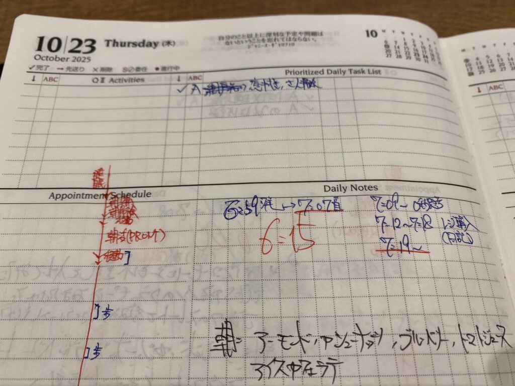 私は起床時間、カフェ到着時間、朝活開始時間を手帳に記録している。