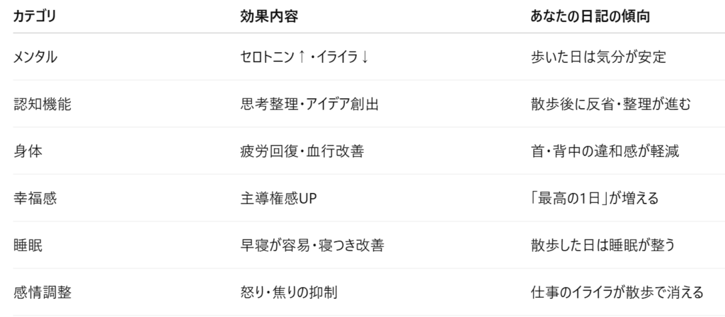 科学的にも正しく、歩行10〜20分でセロトニン神経が活性化し、情緒が安定します。日記データ例